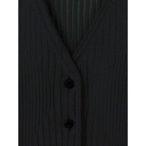 x Ester Manas ribbed cropped cardigan from AZ FACTORY featuring black, ribbed knit, V-neck, spread collar, front button fastening, long sleeves, contrasting border, scallop hem and cropped. Cropped top Size and Fit - This piece fits true to size. We recommend you get your regular size. Model is 1,75m / 5ft 8in wearing size S