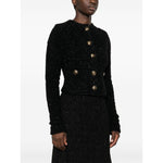 black cotton blend bouclé construction metallic threading crew neck long sleeves two front patch pockets logo-embossed buttons cropped full lining straight hem front button fastening Bouclé cropped jacket Size and Fit - BUST: 68.0 Centimetres. LENGTH: 44.0 Centimetres. WAIST: 64.0 Centimetres. SLEEVE LENGTH: 78.0 Centimetres. Shoulder Width: 36.0 Centimetres.