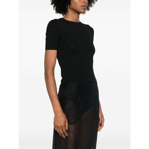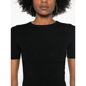 black wool blend fine knit BB pattern pointelle knit crew neck short sleeves straight hem Open-knit wool top