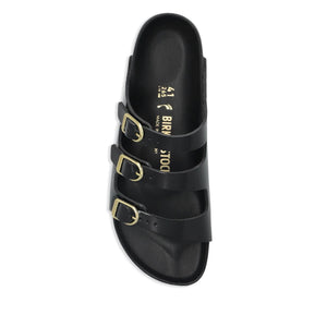 • Black Birkenstock Sandals with buckle strap, slip-on, round open toe, rubber sole, narrow width, Florida leather style.
