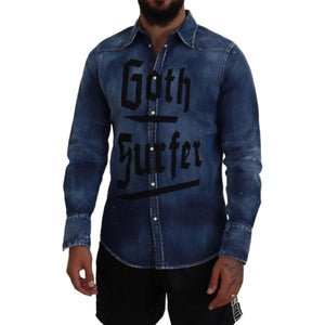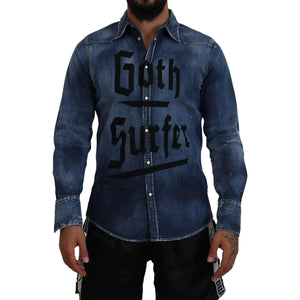 • Dsquared² Blue Washed Goth Surfer Print Men Denim Shirt