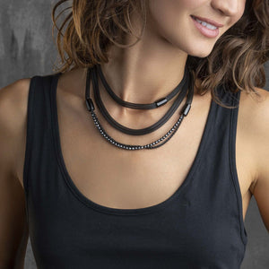 • Woman wearing BREIL JEWELS Mod. TJ2938 bracelet with elegant black design, shown in an official box packaging.