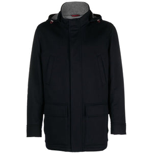 midnight blue cashmere/silk-cotton blend stand-up collar detachable drawstring hood concealed front fastening long sleeves belted cuffs two side slit pockets two side flap pockets straight hem Cashmere parka coat