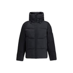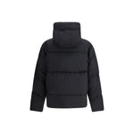 The Down jacket by Golden Goose made of nylon with tonal logo appliqué on the sleeve features a drawstring hood, zipper closure, front zipper pockets and lined interior with mesh pockets, completed with adjustable drawstring at the bottom.