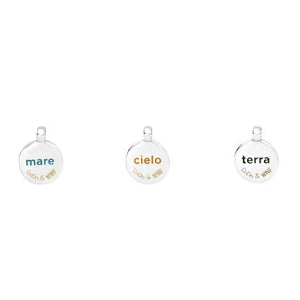 Three charms with inscriptions 'mare', 'cielo', and 'terra', representing Dodo & WME. CHARMS DODO MOD. DMC3007SPWWFEMXAG design.