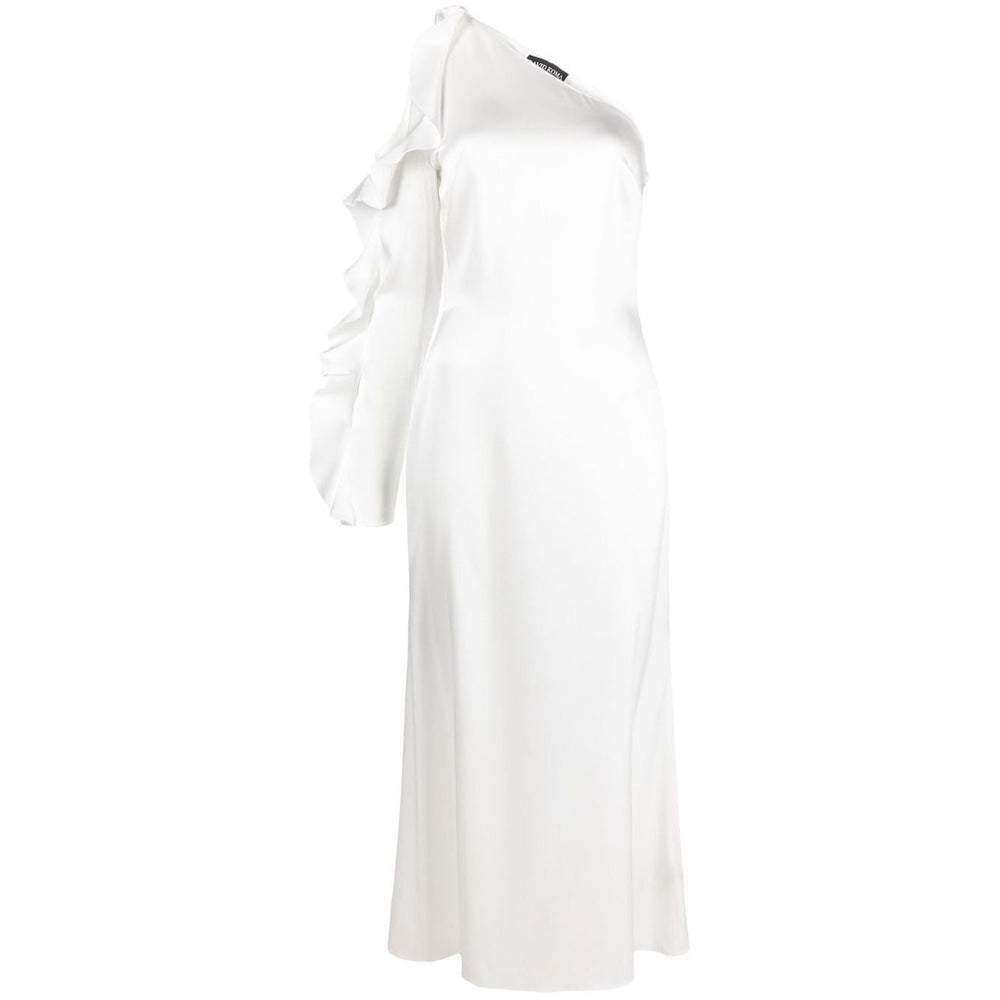 one-shoulder ruffled dress from DAVID KOMA featuring ivory white, satin finish, ruffled detailing, one-shoulder, single long sleeve, concealed side zip fastening, curved hem and mid-length. Ruffle detail one shoulder midi dress Size and Fit - This piece fits true to size. We recommend you get your regular size. Model is 1,75m / 5ft 8in wearing size 8 (UK)