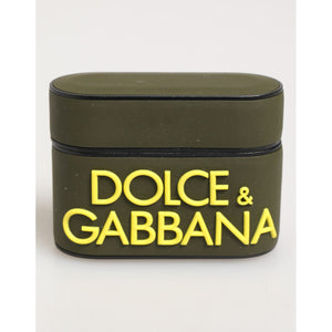 Dolce & Gabbana Army Green Rubber Logo Embossed Accessory Airpods Case in army green with yellow logo, stylish protection for AirPods.