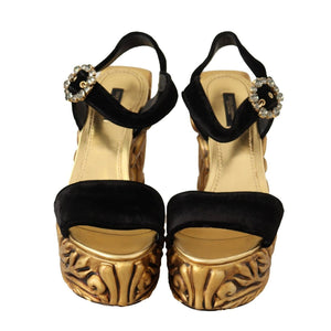 Dolce & Gabbana Black Gold Baroque Velvet Heels Crystal Shoes