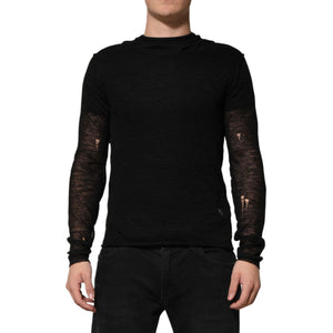 Dolce & Gabbana Black Linen Mesh Tattered Longsleeves T-shirt