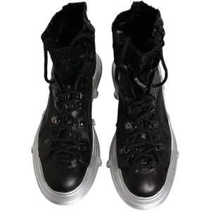 Discover the epitome of modern luxury with these Dolce & Gabbana ankle boots, crafted from the finest lambskin and nylon. Make a bold statement with the sleek black leather upper contrasted by a silver rubber sole for unmatched style and durability. The inner knee-high nylon acts as an elastic sock, ensuring comfort and an avant-garde edge. Designed in Italy, these boots redefine sophistication with their exceptional craftsmanship. Perfect for style connoisseurs who dare to stand out.