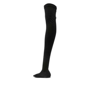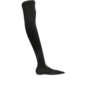 black stretch-jersey pointed toe thigh-length branded leather insole flat leather sole pull-on style Stretch jersey over-the-knee boots Size and Fit - Heel 0,4 in / 1 cm