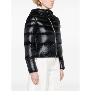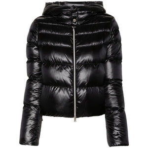 black feather down padded design classic hood press-stud fastening collar front two-way zip fastening long sleeves two side zip-fastening pockets cropped drawstring hem full lining Nylon down jacket