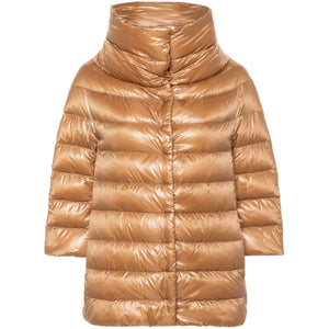 camel brown down-feather filling padded design quilted stand-up collar three-quarter length sleeves two side inset pockets straight hem front press-stud fastening Aminta nylon cape