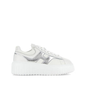 white leather metallic finish front lace-up fastening logo-print tongue branded insole round toe flatform sole H-Stripes leather sneakers Size and Fit - Heel 2,2 in / 5,5 cm, Platform 1,6 in / 4 cm