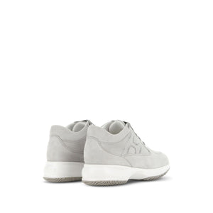 Interactive crystal-embellished sneakers from HOGAN featuring medium grey, calf leather, suede, crystal embellishment, logo-embellished side panels, round toe, front lace-up fastening and flat rubber sole. Interactive suede sneakers Size and Fit - Heel 1,6 in / 4 cm; Platform 1 in / 2,5 cm