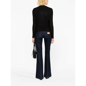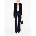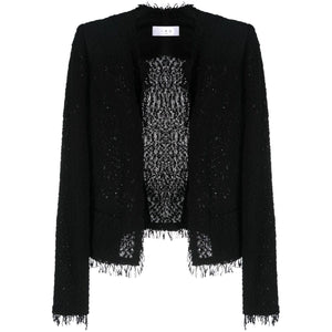 black cotton blend textured finish fringe detailing round neck open front long sleeves two side welt pockets Shavani cotton jacket