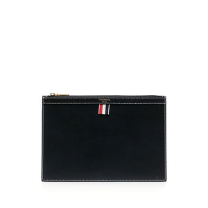 4-Bar tab document holder from THOM BROWNE featuring striped lining, signature 4-Bar tab, logo stamp to the front, top zip fastening, main compartment, internal logo patch, navy blue and calf leather. Smalle leather document case Size and Fit - Width 11,42 in / 29 cm Height 7,87 in / 20 cm