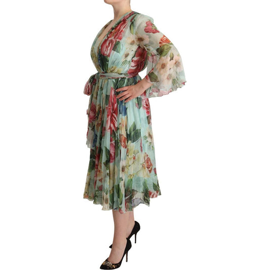 阳光丝绸混纺长裙 - 长袖和深 V 领
